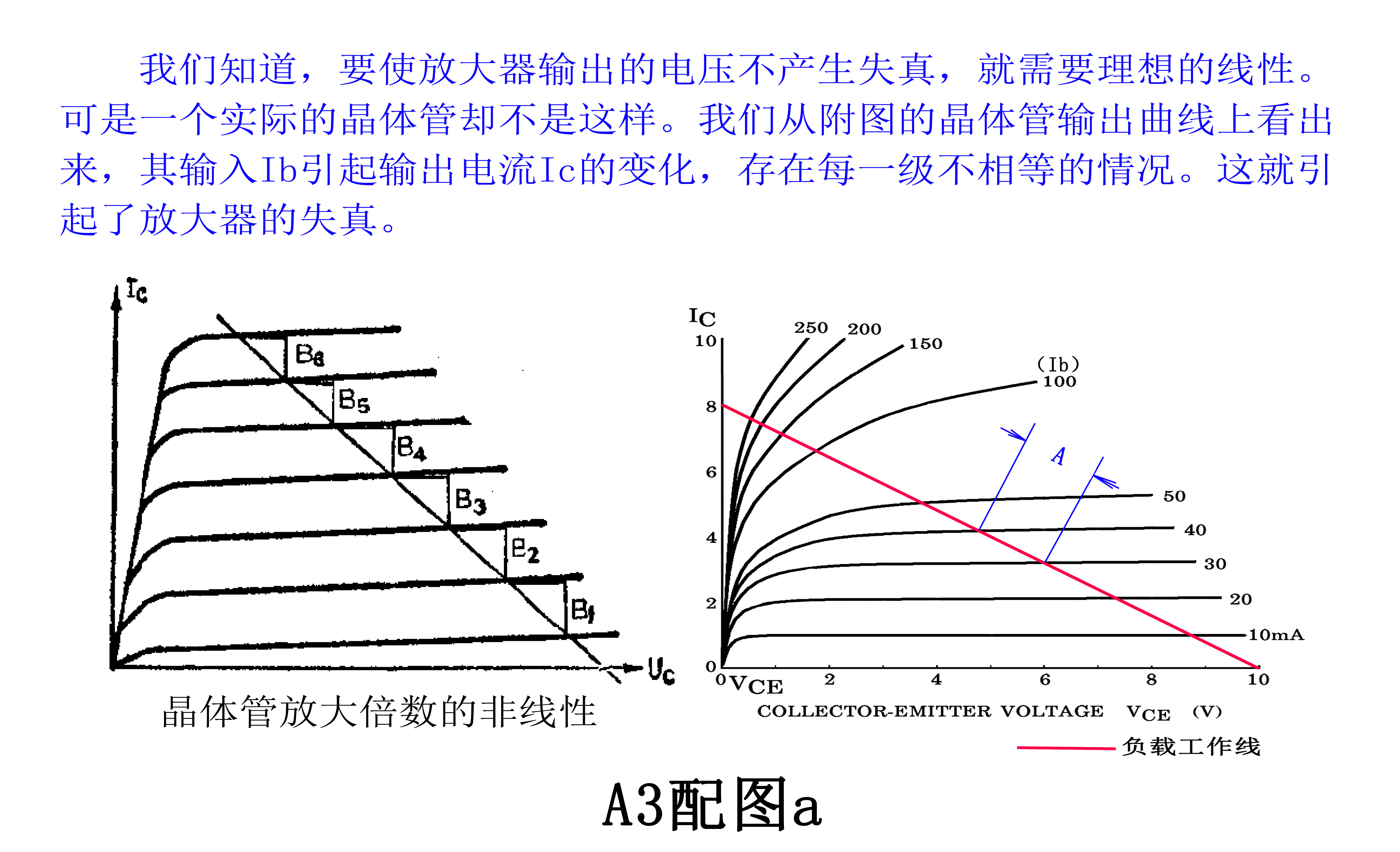 一个理想的放大器应该是一个输入信号波形经放大了的精确的复制品。但是,由于担任主要核心放大器件的晶体管、电子管,它们的放大曲线都不是线性的,如A3配图a所示。所以,经过音频放大器处理的音频信号都会发生畸变。我们把这种畸变称为放大器的失真。