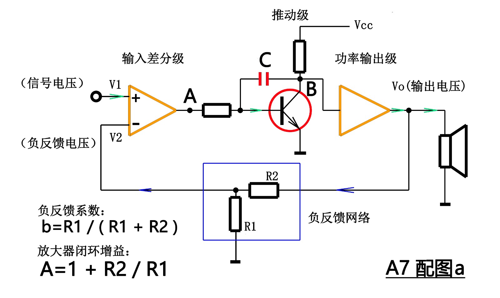 晶体管功率放大器的拓扑是一个多级放大的大环路,由于晶体管PN多节结构存在着一定的级间电容,在环路结构中产生相移,为了避免大环路放大的自激振荡问题,就需要在前置推动级晶体管的bc极之间并联一只小电容C进行相移补偿。如A7配图a所示。