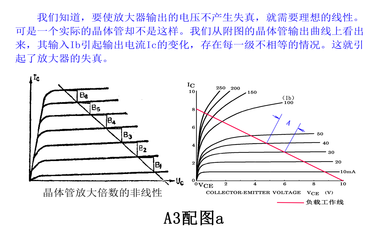 一个理想的放大器应该是一个输入信号波形经放大了的精确的复制品。但是,由于担任主要核心放大器件的晶体管、电子管,它们的放大曲线都不是线性的,如A3配图a所示。所以,经过音频放大器处理的音频信号都会发生畸变。我们把这种畸变称为放大器的失真。