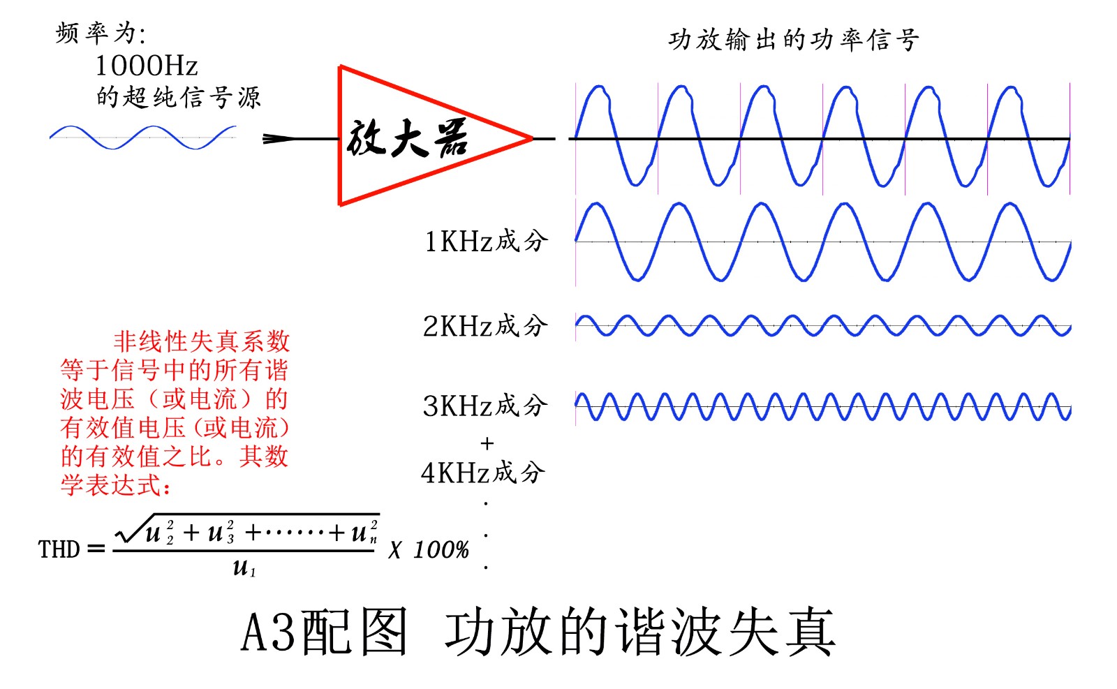 总谐波失真(THD)是放大器产品手册中使用最多的一种方法。其原理是:在放大器的输入端输入一个没有失真的纯净正弦波信号,然后在放大器的输出端,测量输出信号的正弦波基波,以及因为放大器的非线性,新生成各次谐波的分量之比。它的原理如A3配图b所示。